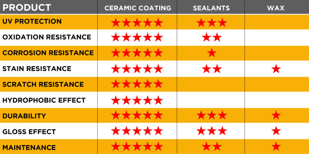 The newest protection technology is ceramic coating. They usually contain silica dioxide, which is an incredible hard-like glass polymer. A bit more skill is required to prepare the paint and apply them. But the result is a thick glass-like layer that protects your vehicle’s paint. This thickness gives it an incredible deep gloss. The hardness gives you long-lasting durability. And unlike waxes and sealants, they are resistant to detergents and chemicals.